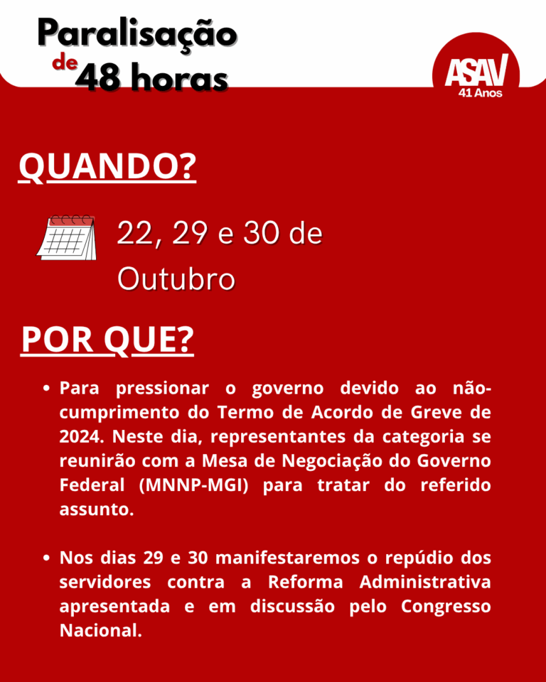 Em assembleia da Asav Sindicato realizada no dia 16 deste mês, os servidores técnico administrativos deliberaram pela aprovação das paralisações indicadas pela Fasubra. A primeira