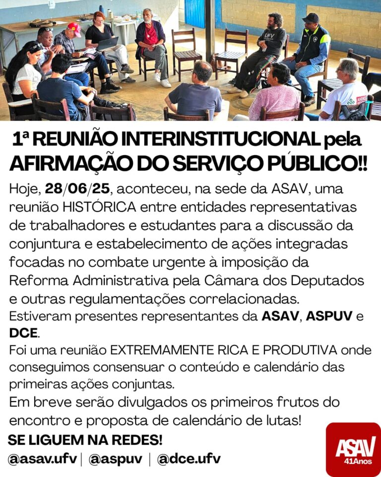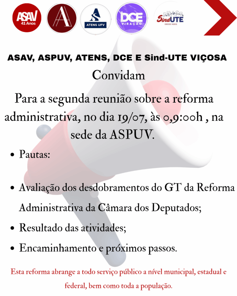 📣 Convite Importante! ASAV, ASPUV, ATENS, DCE e Sind-UTE Viçosa convidam para a 2ª reunião sobre a Reforma Administrativa. 🗓 Data: 19/07 ⏰ Hora: 09h