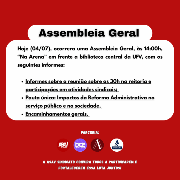 📣 Hoje (04/07) tem Assembleia Geral! 🕑 Às 14h, na Arena, em frente à Biblioteca Central da UFV. Na pauta: 📌 Informes sobre as 30h