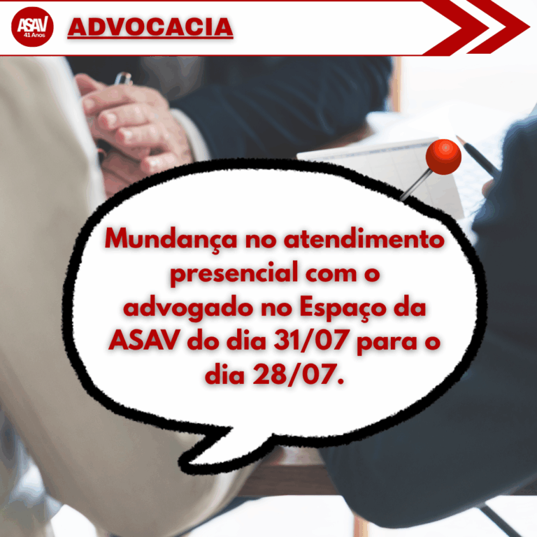 Informamos que, devido a ajustes na agenda do advogado que atende na ASAV, o atendimento presencial agendado para o dia 31 de julho de 2025