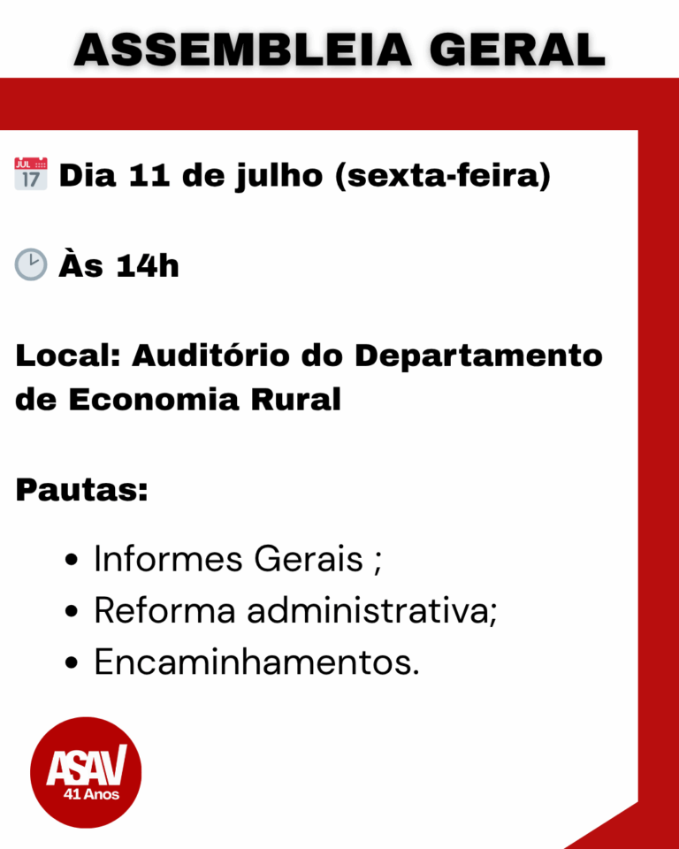 No dia 11 de julho, sexta-feira, às 14h, no auditorio do departamento de economia rural para tratar das seguintes pautas: Informes Gerais ; Reforma administrativa;