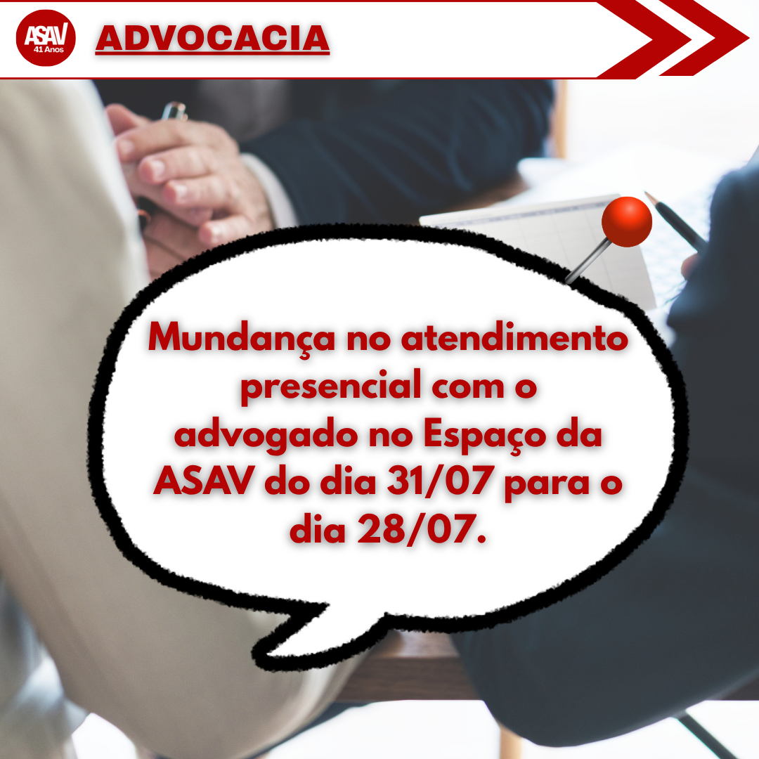 Informamos que, devido a ajustes na agenda do advogado que atende na ASAV, o atendimento presencial agendado para o dia 31 de julho de 2025 no Espaço da ASAV será antecipado para o dia 28 de julho de 2025.