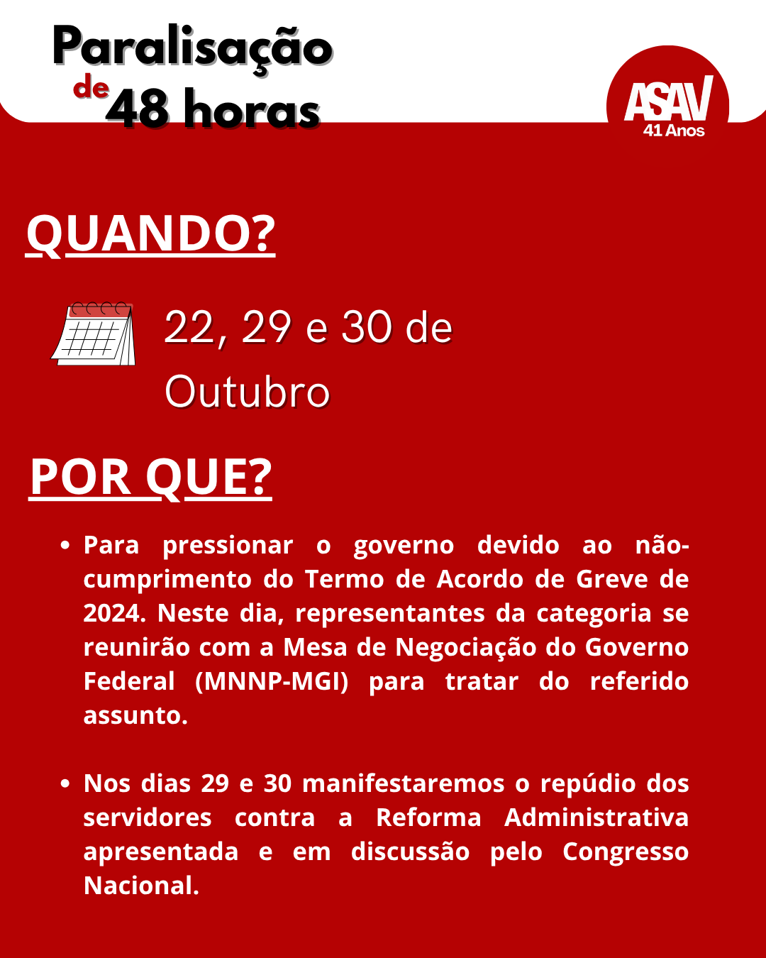 🚫 Nos dias 29 e 30, a paralisação de 48h é um ato de repúdio à Reforma Administrativa que tramita no Congresso e ameaça, entre outros pontos, a estabilidade dos servidores públicos.
